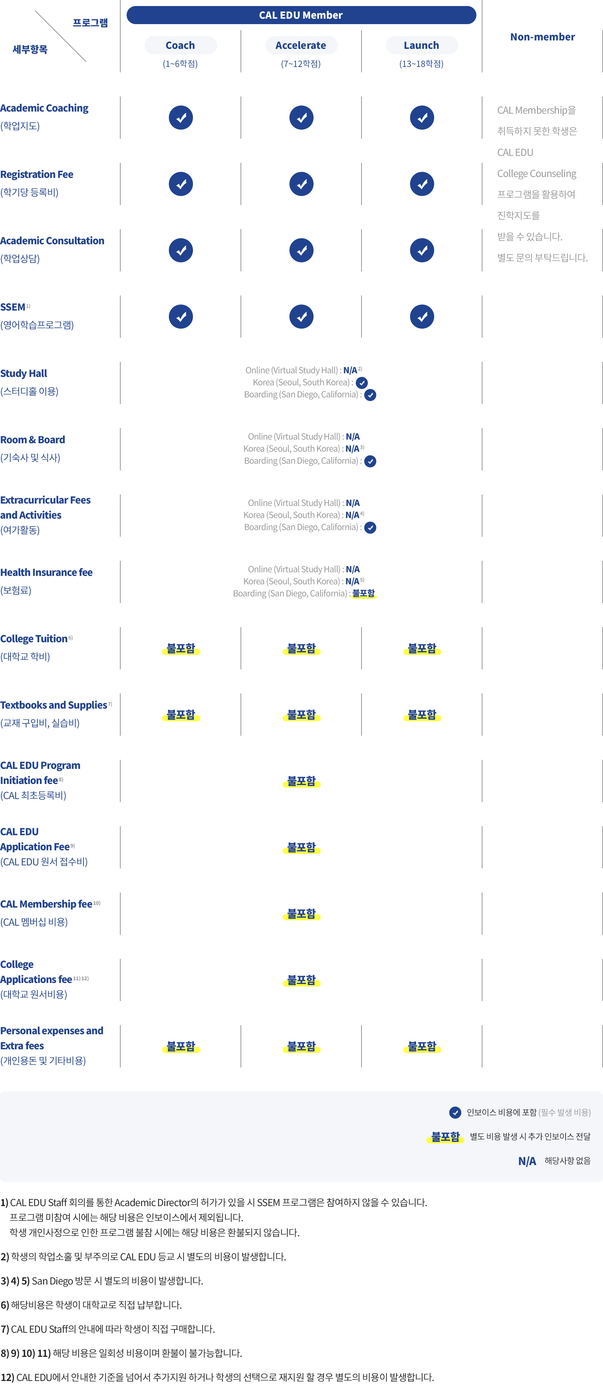 - ** CAL Membership 비용을 납부하지 않을 경우에는 CAL EDU에서 진학 보장을 하지 않습니다. 학업상담을 계속 CAL EDU를 통해 진행 희망하는 경우 CAL EDU College Counseling 서비스를 활용하여 도움받을 수 있습니다.